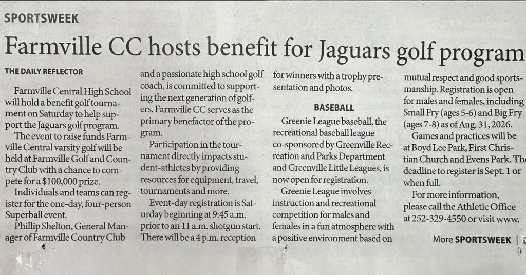 Farmville Country Club is the proud home of FCHS’s golf program. The Club holds an annual benefit tournament to fund the team for the season. These funds purchase golf bags, team uniforms, practice balls, and course access fees for away matches. Any current team member is given a complimentary junior membership while he or she is part of the program. We strive to grow the game right here in our home town!